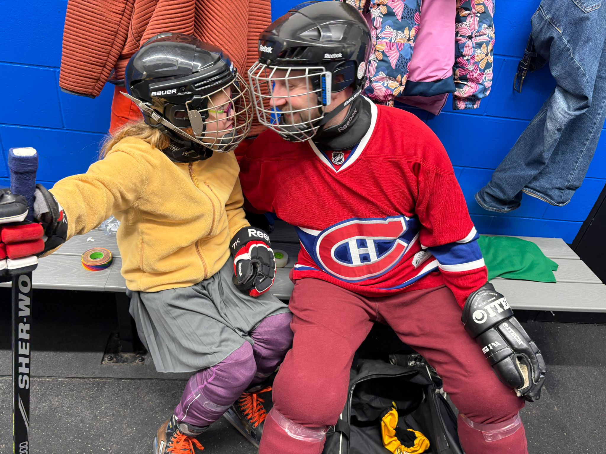 I scrounged up a bit of resolve and sought to develop some hockey skills in the family– in addition to my already prodigious ones, of course. We figured out if Zoe was righty or lefty and got her set up with a stick and some equipment. We got out on a sheet of ice with the family over the holidays and otherwise found a «stick & puck» program run by the city.
